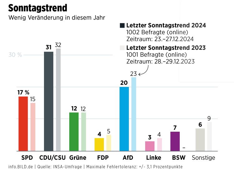 Sondazhi është kryer nga INSA për BILD, ndërsa krahasuar me javën e kaluar CDU ka një rënie me 1 pikë, AfD rënie me 3 pikë dhe SPD një ngjitje me 2 pikë.